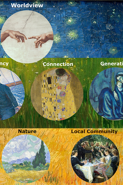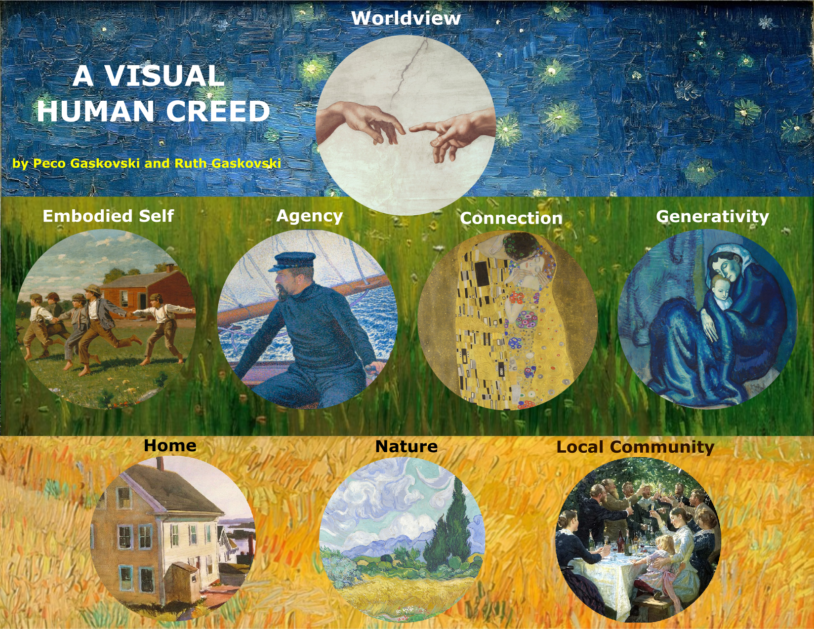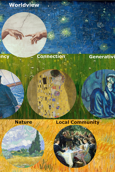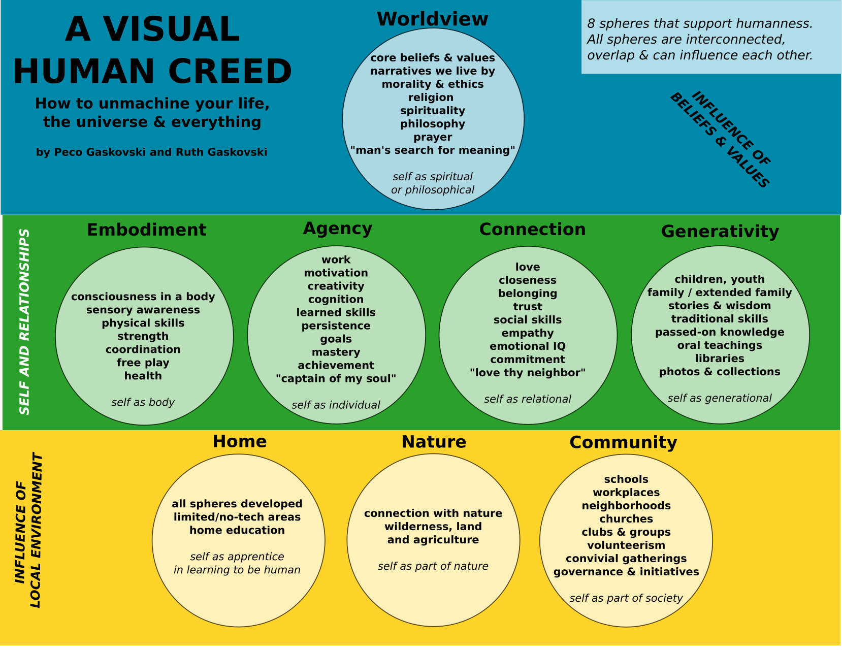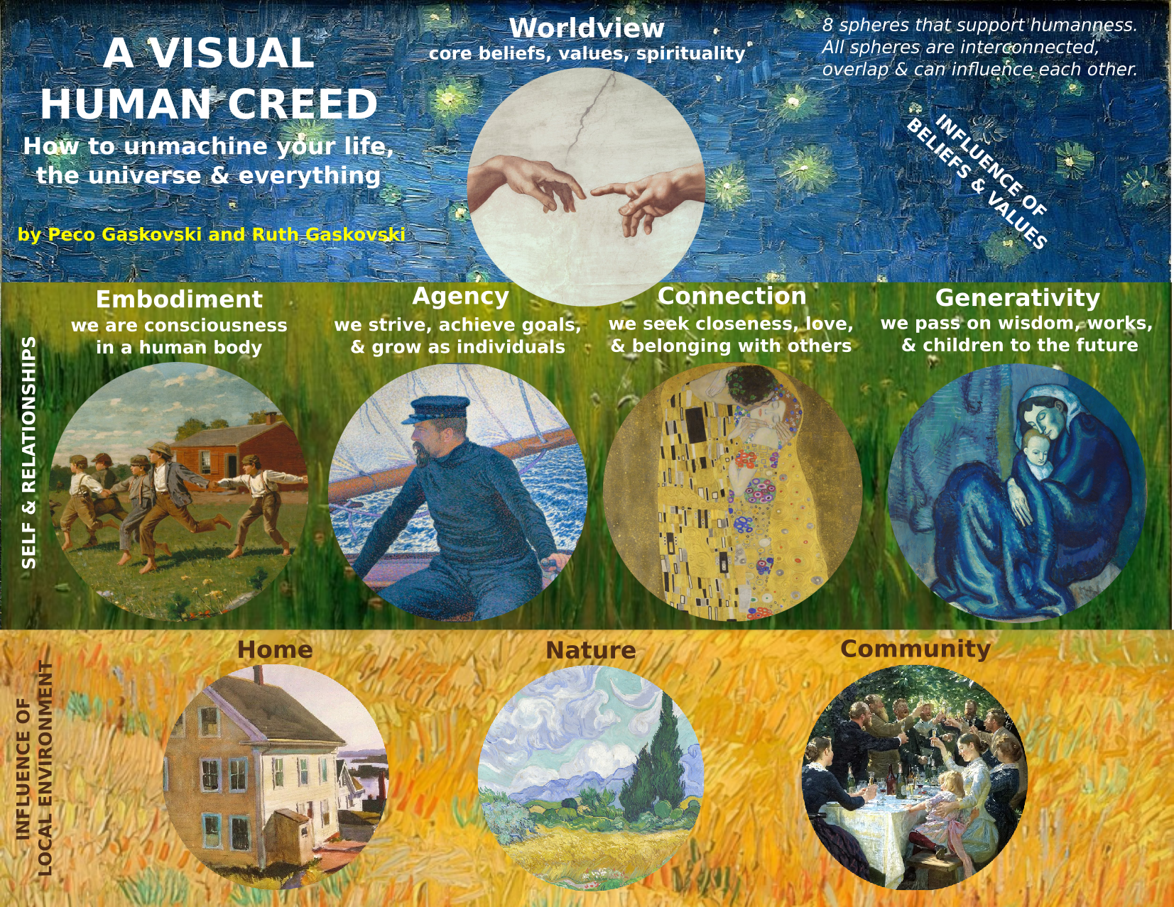The graphics below depict the eight spheres of the “Visual Human Creed”, including: worldview, embodiment, agency, connection, generativity, home, nature, and local community.