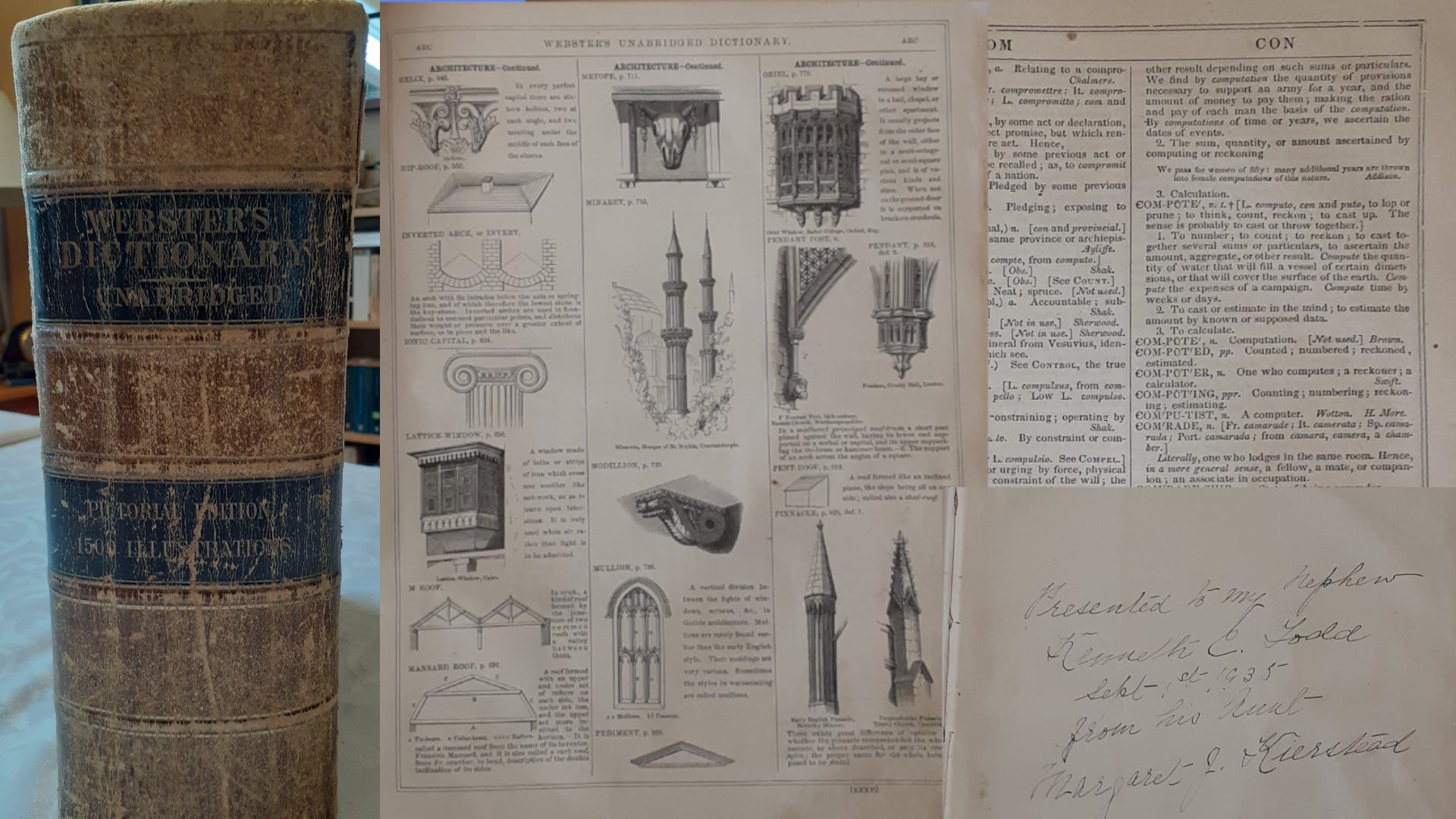 When using especially old editions, we discover etymologies, instances of use, and also glean historical knowledge9. This 1854 Webster’s Dictionary Pictoral Edition is my younger son’s favourite, and the knowledge that writers like Mark Twain or Henry James may have used the same reference adds to the enjoyment.