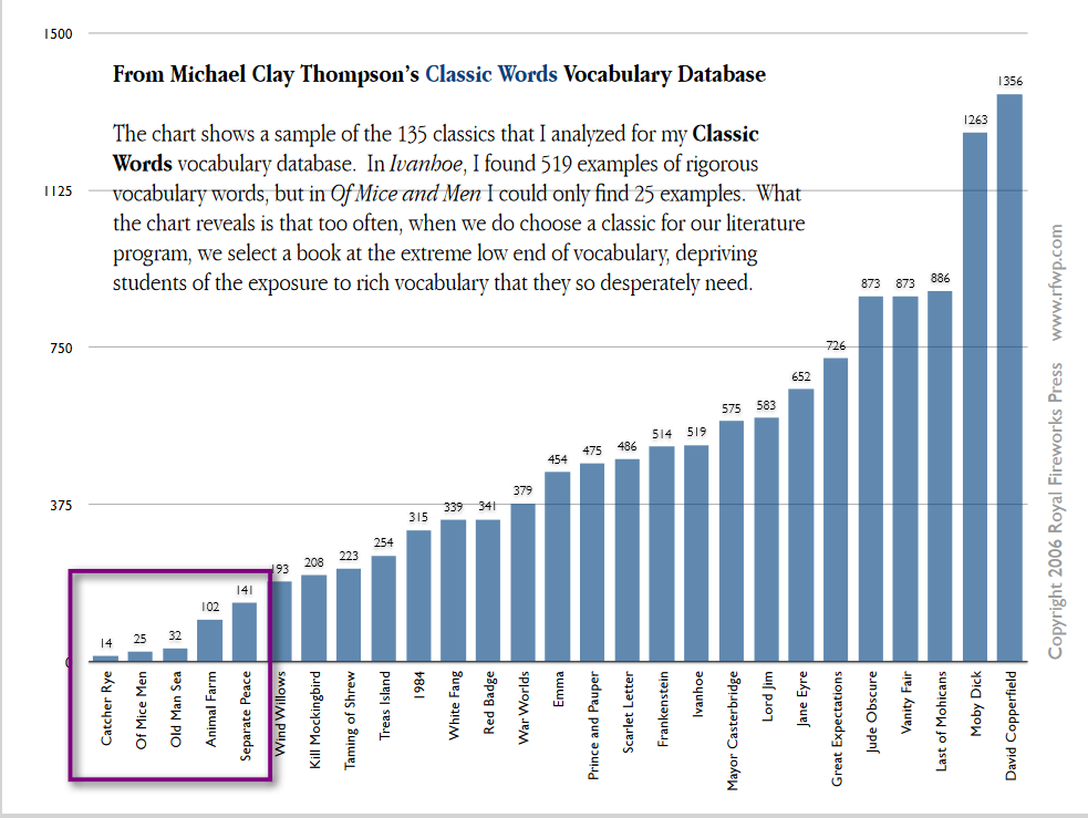 Many classic books that contain a rich cornucopia of language, have been pulled from school curricula because they are deemed too complex, too inaccessible, or simply irrelevant. Long-time readers will recognize this classic vocabulary chart by Michael Clay Thompson which I shared in Raising Writers Against the Machine last year. It shows that classics which are still taught in schools hold a mere vestige of the vocabulary10 which was once considered essential for good communication. In her article Are Books Dead? Jean M. Twenge relates that English teachers in her daughter’s high school leave out books all together and only assign short stories and articles instead.