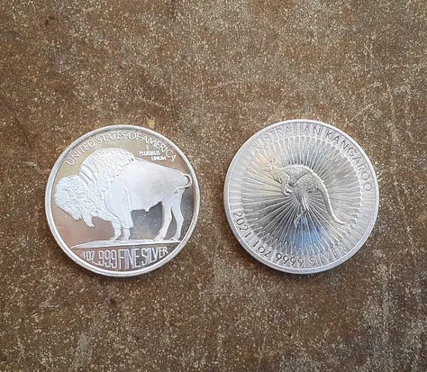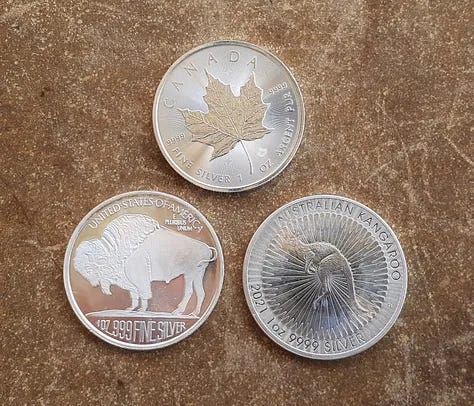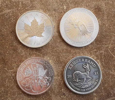 Each coin has an estimated value of $30 US dollars. The silver coins are from Canada, the U.S., Austria, Australia, and South Africa.