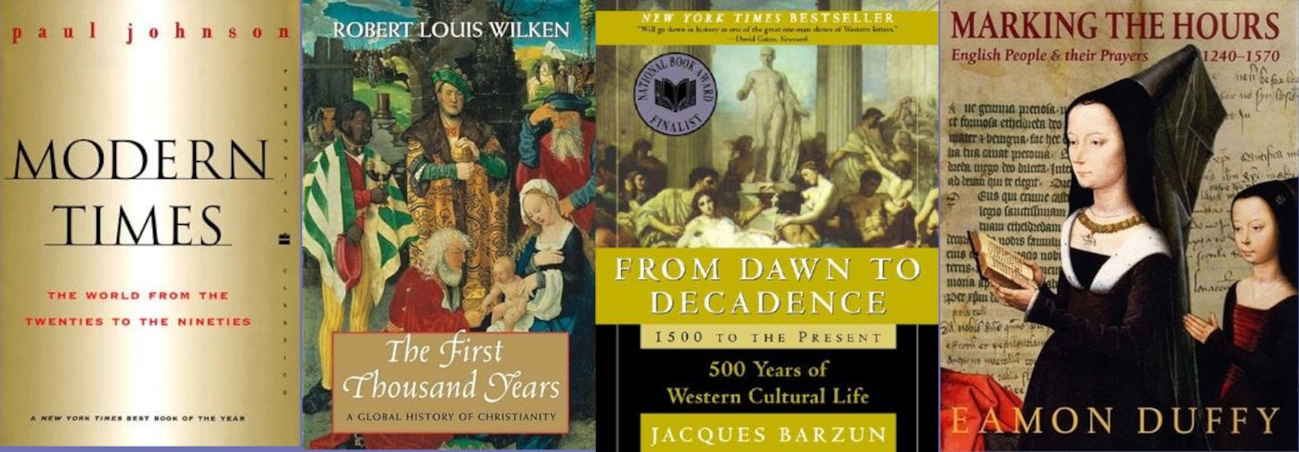 I also like A History of the English-Speaking Peoples by Winston Churchill, First Principles by Thomas Ricks, anything by Roger Scruton or Russell Kirk, and Timeless by Steve Weidenkopf for a good broad overview of Church history.