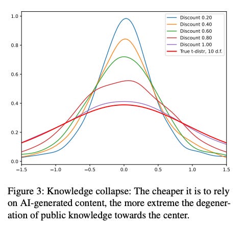 Over time, dependence on these [AI] systems, and the existence of multifaceted interactions among them, may create a “curse of recursion”…in which our access to the original diversity of human knowledge is increasingly mediated by a partial and increasingly narrow subset of views…[so that eventually] certain popular sources or beliefs which were common in the training data may come to be reinforced in the public mindset (and within the training data), while other “long-tail” ideas are neglected and eventually forgotten.