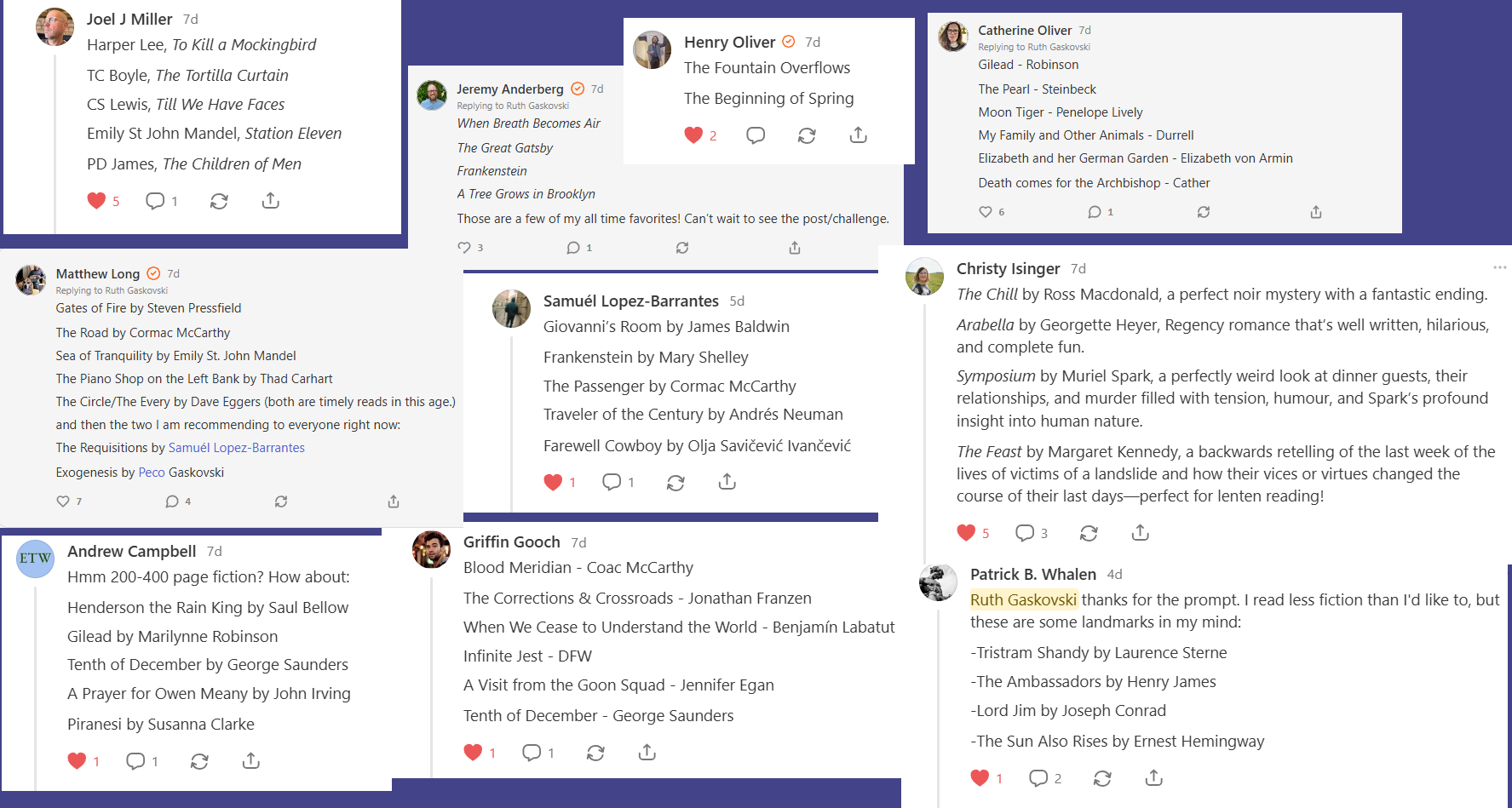 A tremendous THANK YOU to all the writers and readers who contributed! Joel J Miller, Matthew Long, Jeremy Anderberg, Catherine Oliver, Henry Oliver, Kerri Christopher, Griffin Gooch, Andrew Campbell, Patrick B. Whalen, Samuél Lopez-Barrantes, Christy Isinger, 1000GoodBooksProject, & many more.